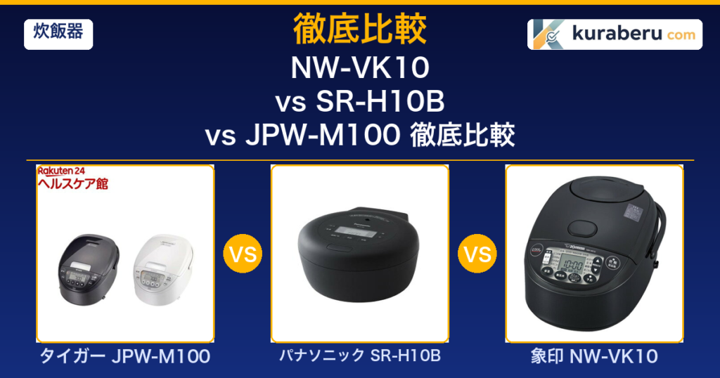 象印NW-VK10・パナソニックSR-H10B・タイガーJPW-M100を5つの軸で徹底比較。保温30時間の象印、コンパクト設計のパナソニック、少量高速15分のタイガー。あなたに最適な1台がわかります。 -