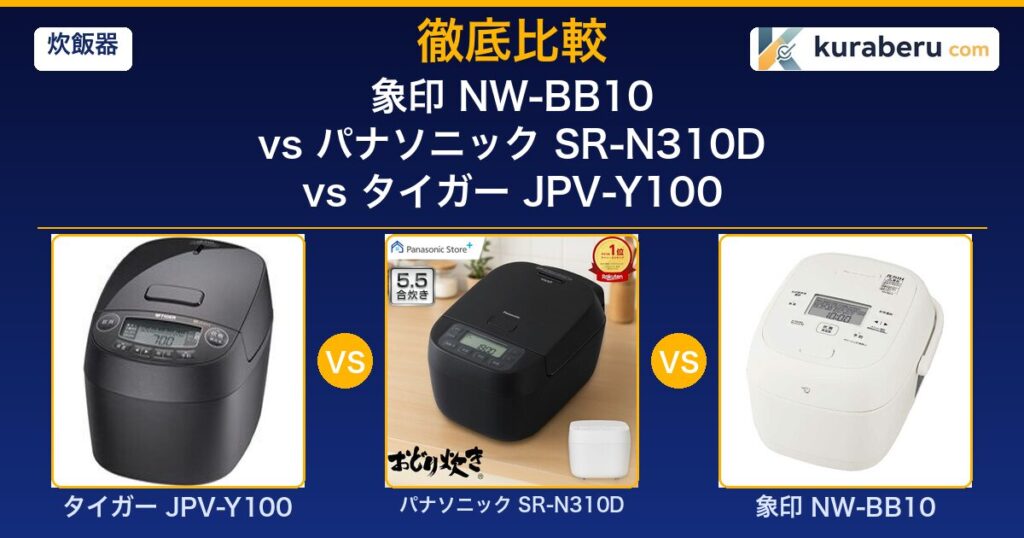 象印NW-BB10・パナソニックSR-N310D・タイガーJPV-Y100を徹底比較。加熱方式・内釜・保温・コスパを実機スペックと口コミで検証し、ライフスタイル別におすすめを紹介します。 -