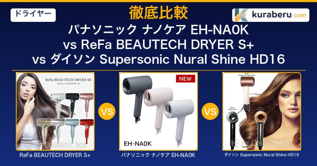 パナソニック ナノケア EH-NA0K・ReFa S+・ダイソン HD16を風量・ケア性能・重量・価格で徹底比較。実際の口コミを分析し、あなたに合う1台がわかります。