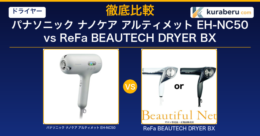 パナソニック ナノケア アルティメイト EH-NC50とReFa BEAUTECH DRYER BXの違いを徹底比較。風量・ケア技術・重量・口コミを検証し、あなたに合った5万円ドライヤーを診断します。 -
