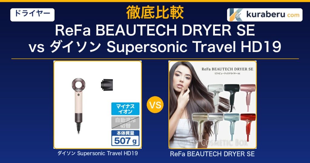 ReFa BEAUTECH DRYER SE(280g)とダイソン Supersonic Travel HD19(507g)を徹底比較。軽さ・海外対応・風量・仕上がり・価格をプロ視点で分析し、あなたに合う1台を提案します。 -
