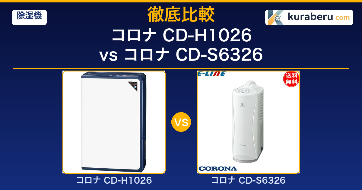 A. 最大の違いはヒーター温風の有無です。CD-H1026はコンプレッサー+ヒーター温風で冬場の衣類乾燥にも対応できますが、CD-S6326はコンプレッサーのみで、主に梅雨〜秋の使用に適しています。除湿能力も10L/日 vs 6.3L/日と差があります。
