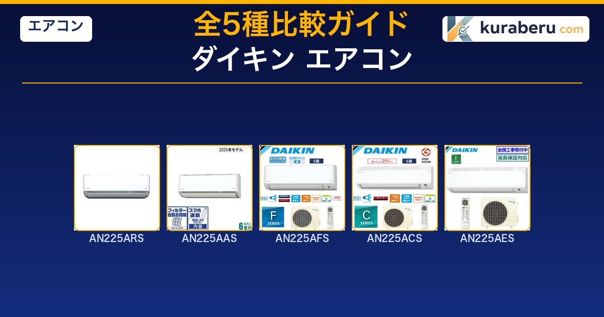 本記事の情報は2026年4月時点のものです。価格・在庫状況・仕様は変動する場合があります。最新情報は各販売サイトをご確認ください。本記事にはアフィリエイトリンクが含まれており、リンク経由でのご購入により当サイトが報酬を受け取る場合がありますが、記事の内容や評価には一切影響しません。なお記載の実勢価格は原則「エアコン本体のみ」の価格帯ですが、Aシリーズ(AN225AAS)は流通が少なく標準工事セット価格を掲載している点にご留意ください。実際の設置には別途標準取付工事費(15,000〜20,000円程度)が必要です。
