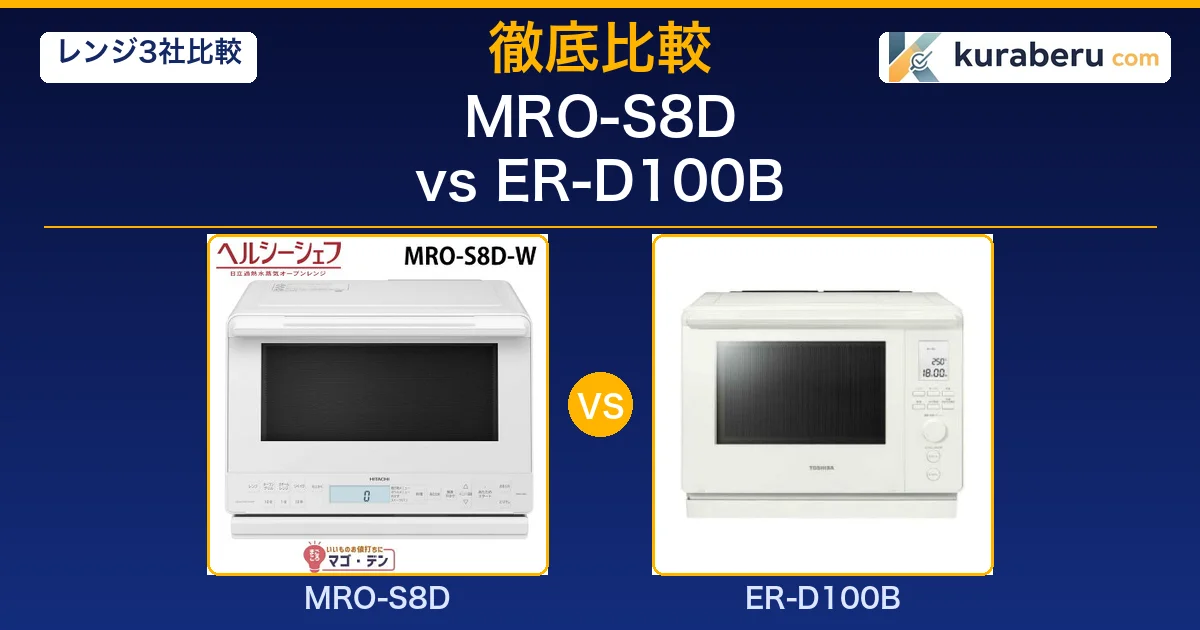 A. 過熱水蒸気の有無です。MRO-S8Dはカップ式過熱水蒸気を搭載しており、ノンフライ調理やヘルシー蒸し調理が可能です。ER-D100Bは角皿式の簡易スチームのみで、過熱水蒸気には対応していません。