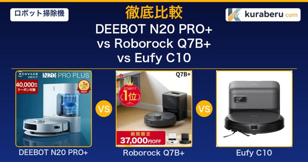 DEEBOT N20 PRO PLUS・Roborock Q7B+・Eufy Auto-Empty C10を徹底比較。吸引力・水拭き・ナビゲーション・コスパを5軸で採点。2026年3月の最安値・口コミ・ペルソナ別おすすめも紹介。