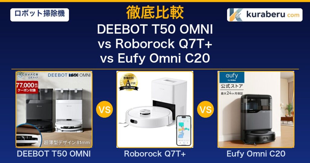 DEEBOT T50 OMNI・Roborock Q7T+・Eufy Omni C20を徹底比較。吸引力・水拭き・自動化・コスパを実機データで検証し、あなたに最適な1台を提案します。 -