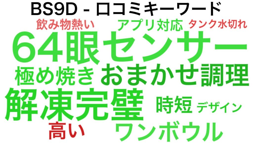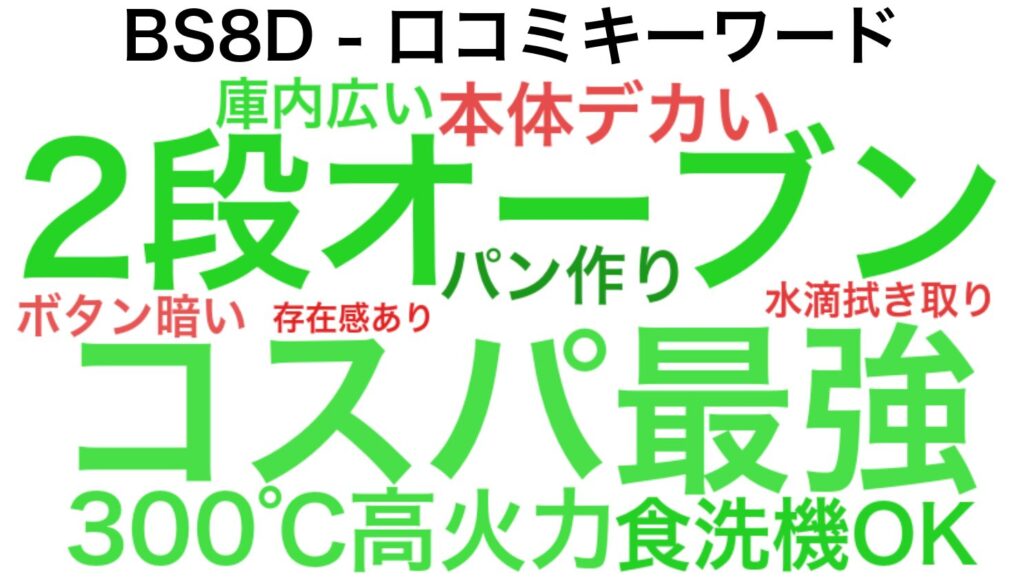 「コスパが良い」「2段オーブン」という評価(緑色)が多い一方、「ボタン」など(赤色)については、やはり上位機種との差を感じるユーザーもいるようです。