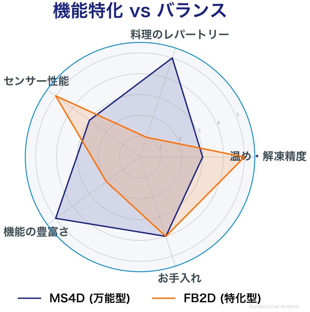 チャート左下の「調理の多様性」はMS4Dが圧倒しています。MS4Dはオーブンレンジなので、グラタンを焼いたり、トーストを焼いたり、クッキーを作ったりできます。対するFB2Dは「単機能レンジ」のため、これらが一切できません。「レンジ機能しか使わない」と割り切れるかどうかが最大の分かれ目です。